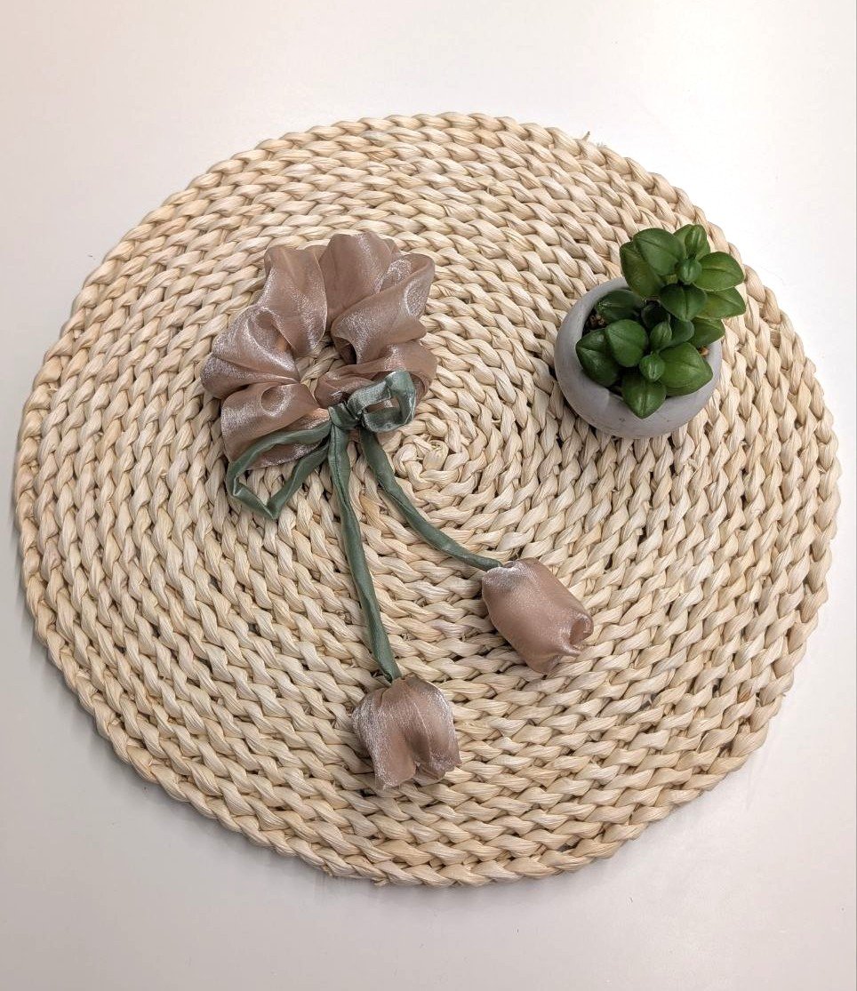 Our premium Golden scrunchie, adorned with two gorgeous tulip - like ribbon details, is the perfect way to add a sweet, stylish flourish to any look.