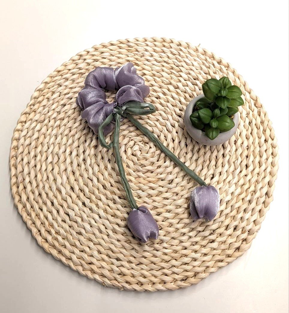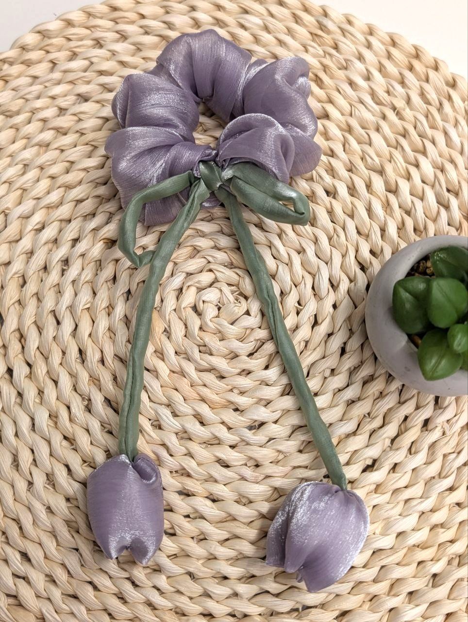 Our Premium Lilac Violet scrunchie, adorned with two gorgeous tulip - like ribbon details, is the perfect way to add a sweet, stylish flourish to any look.