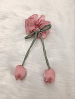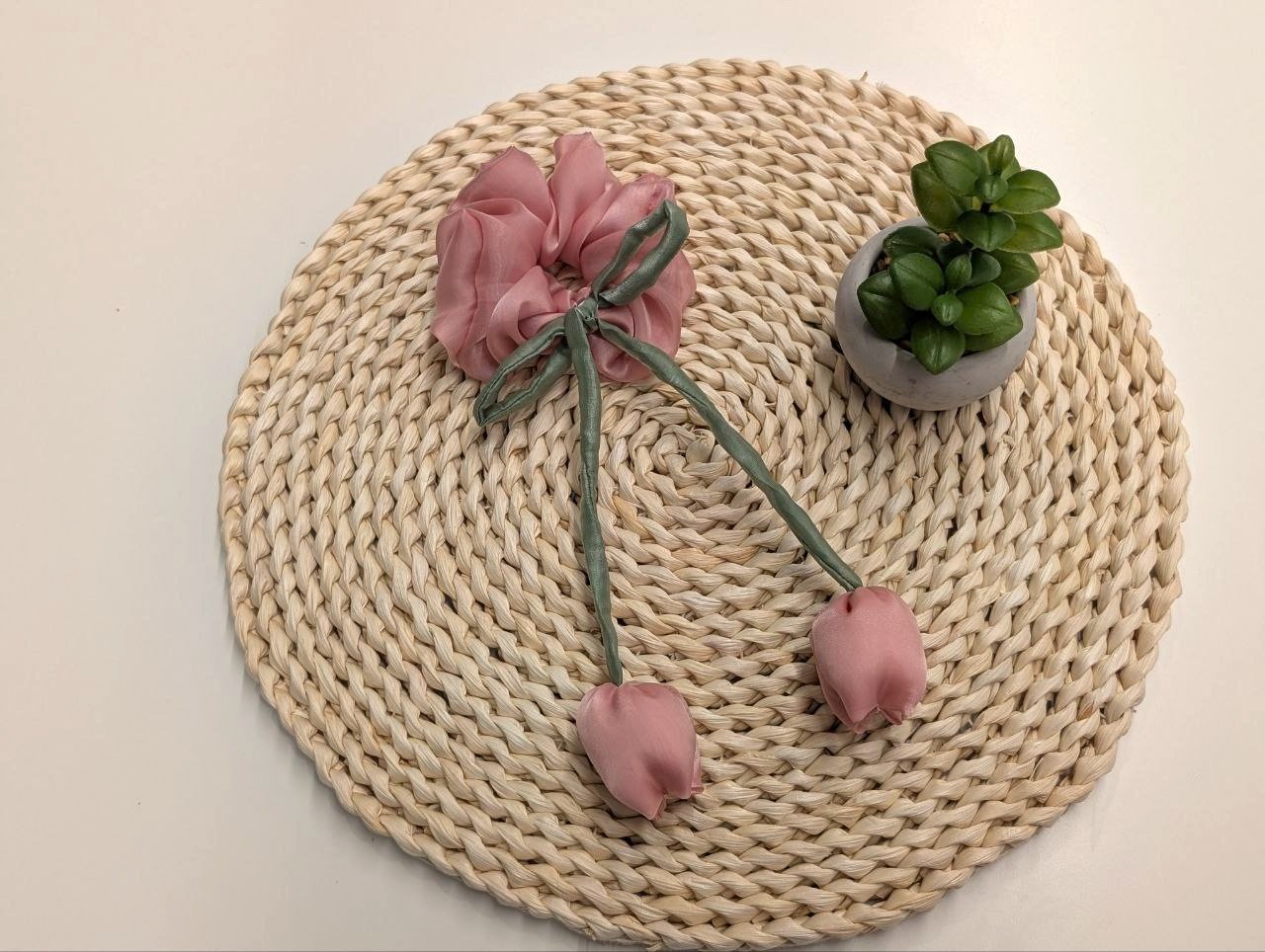 Our premium pink scrunchie, adorned with two gorgeous tulip - like ribbon details, is the perfect way to add a sweet, stylish flourish to any look.